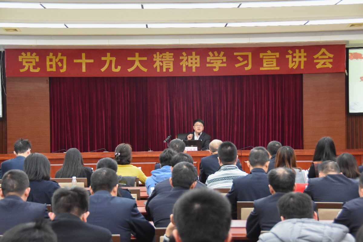 王树斌同志以“新时代 新征程 新篇章——党的十九大精神学习宣讲会”为主题,分别从“十九大及报告概况”、“直观解读十九大报告”、“新提法、新概念解读”、“贯彻新时代要求”四大部分对党的十九大报告进行了宏观概述,对“中国共产党人的初心和使命”等三十二个新提法、新概念进行了梳理。