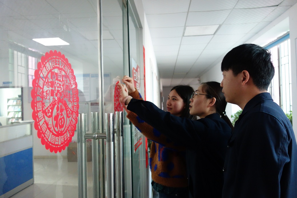 (图2:项目部的工作人员正在张贴春联、窗花)